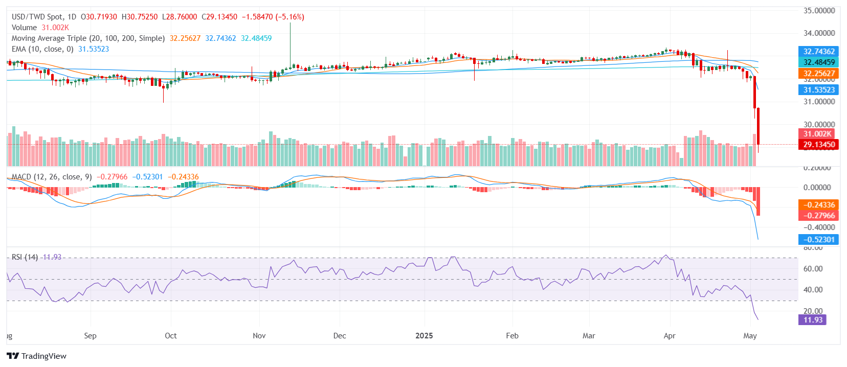 美元/新台币周一暴跌至28.90区域,历史性崩溃进一步加深,此前周五下跌4.4%,加上周一的5.7%跌幅。