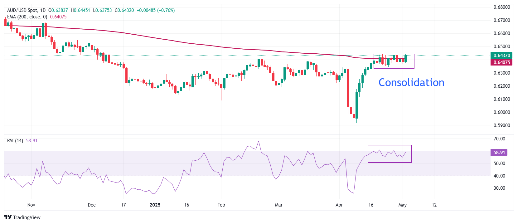 澳元/美元价格预测:近两周徘徊在200日EMA0.6400附近