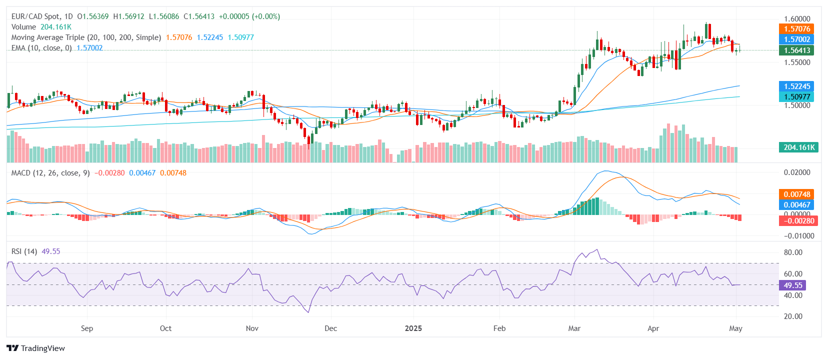 周五欧洲时段结束后,欧元/加元在1.5600区域附近徘徊,日内变化不大,但整体保持稳定的看涨偏向。价格走势仍然局限于日内区间的中间,反映出持续的盘整。