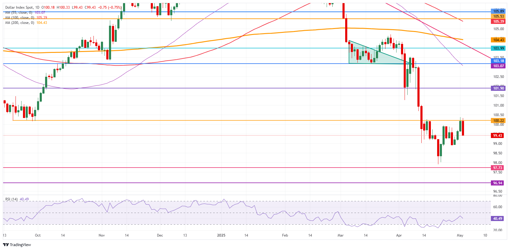 美元指数(DXY)跟踪美元(USD)相对于六种主要货币的表现,在周五写作时保持受限,跌至99.50,此前在100关口出现虚假突破和强烈拒绝。