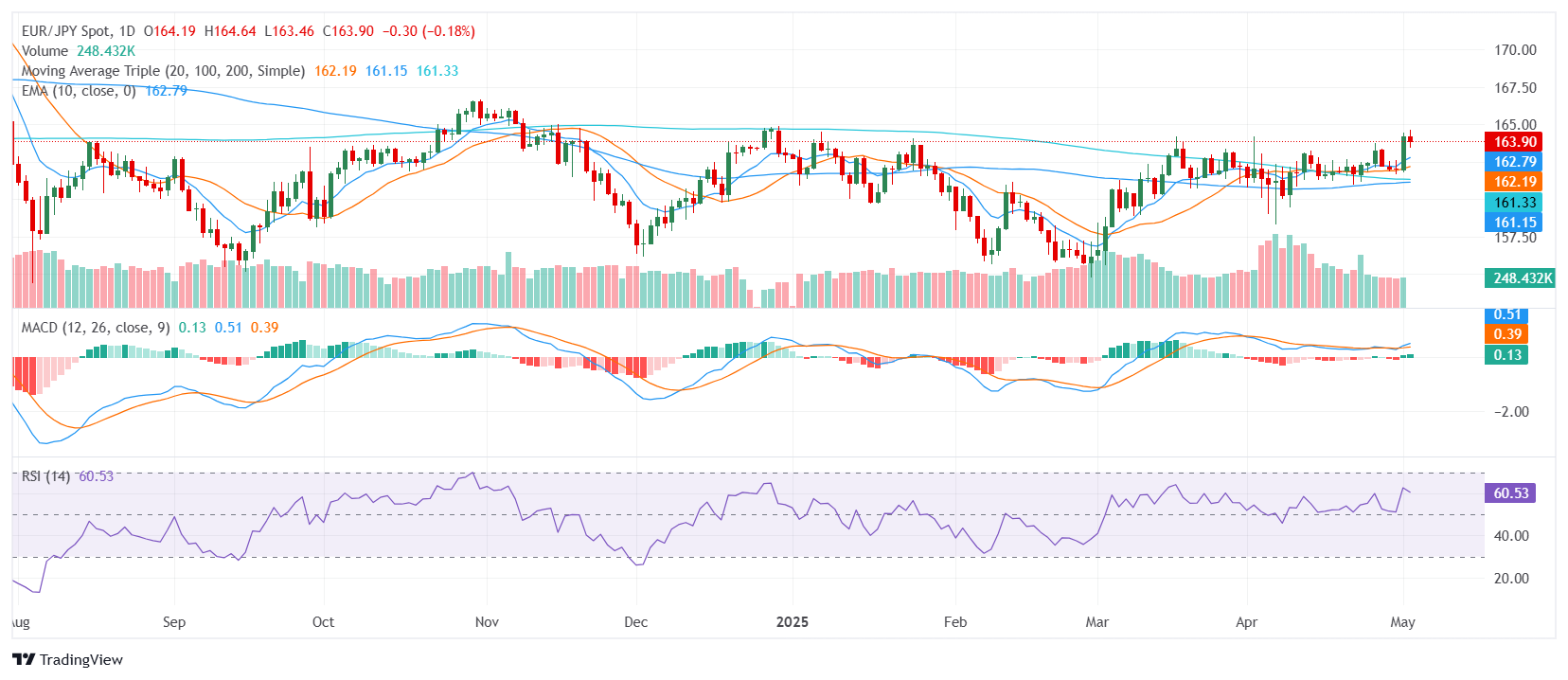欧元/日元价格分析:欧元在164.00附近整固,趋势保持向上