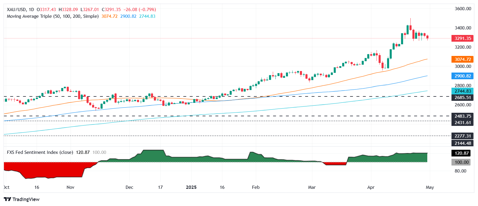 周三北美时段,黄金在触及日高 3,328 美元后下跌约 0.69%。美国(US)数据显示经济收缩,进一步引发了市场对美联储(Fed)降息的猜测