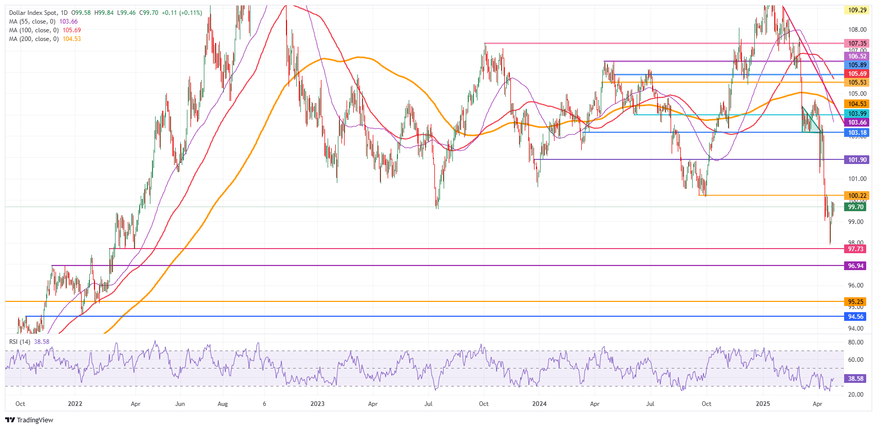 美国美元指数(DXY)跟踪美元(USD)对六种主要货币的表现,本周一在接近100.00关口时走势平平。