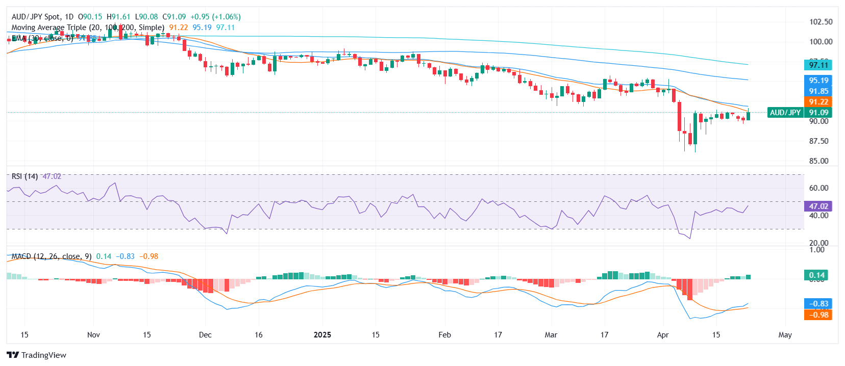 周三交易中,澳元/日元交投于91.00区域,在亚洲时段前小幅上涨。尽管从早些时候的低点反弹,但该货币对整体仍保持看跌基调,受到关键移动平均线和疲软动能背景的限制。