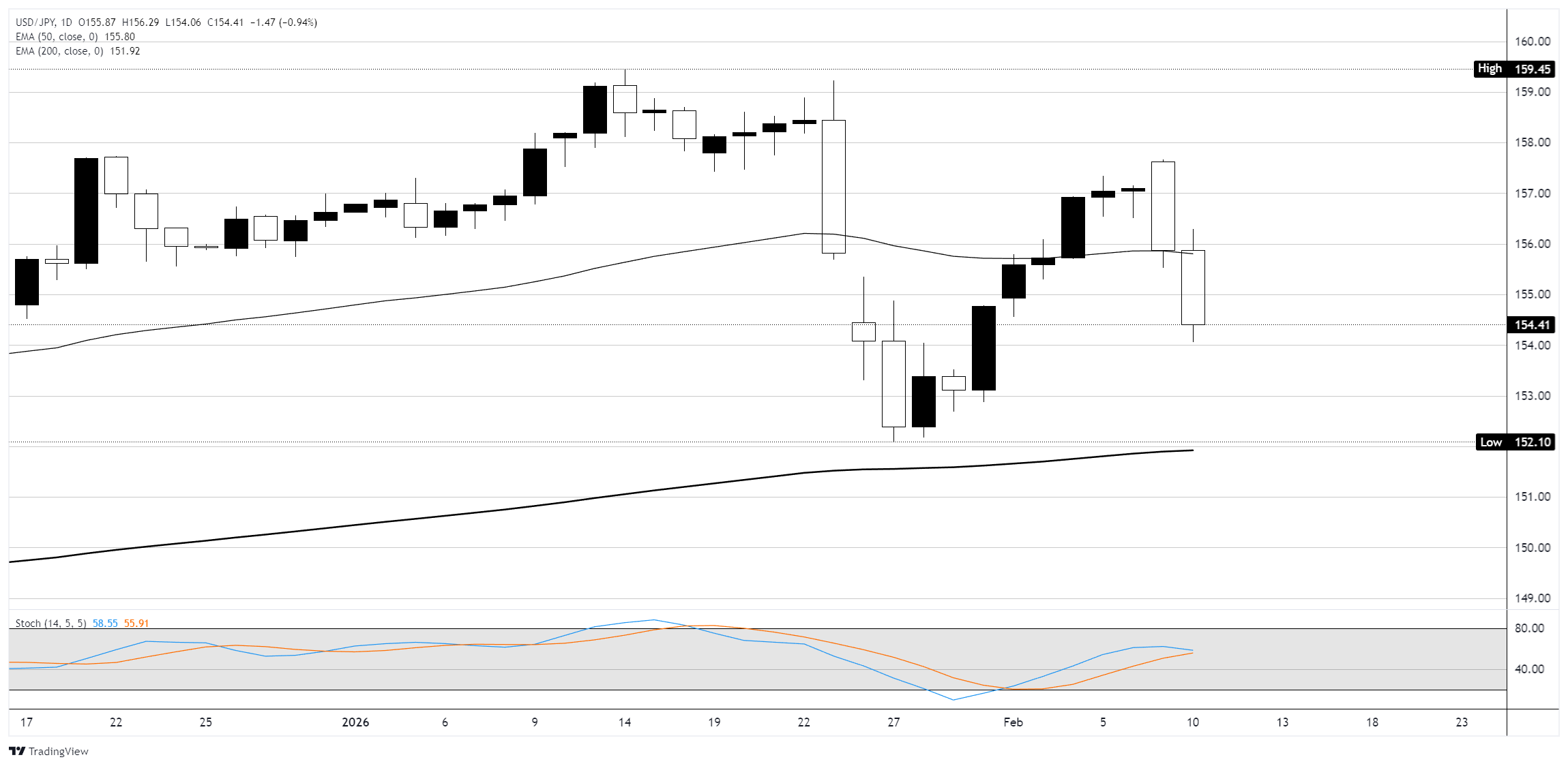 美元/日元在日图上交易于波动的区间震荡结构, oscillating between 1月高点接近159.450和1月底摆动低点152.100之间。