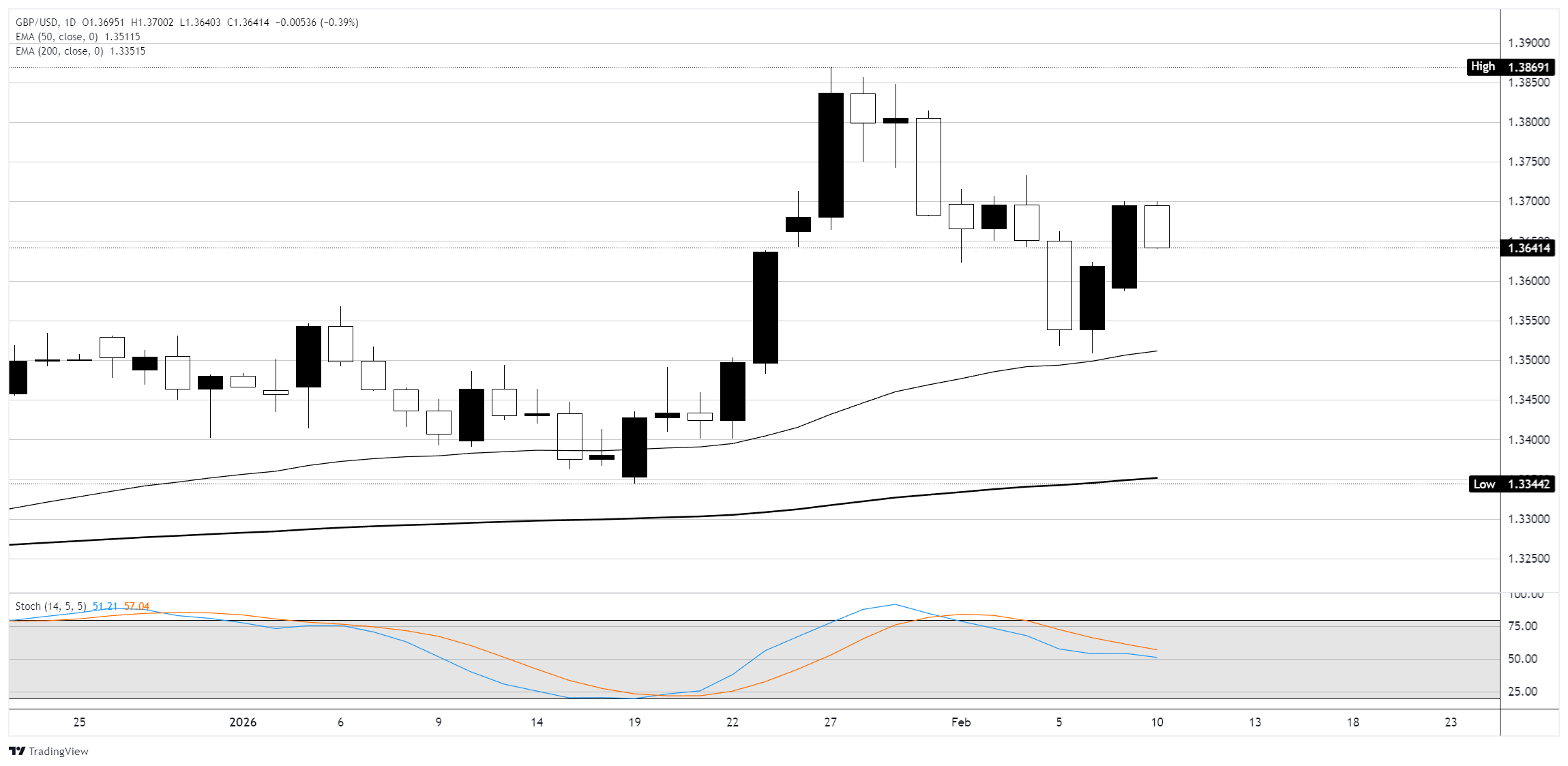 英镑/美元在周二回落,此前周一从 1.3510 低点强劲反弹,收于 1.3641,盘中下跌 0.39%