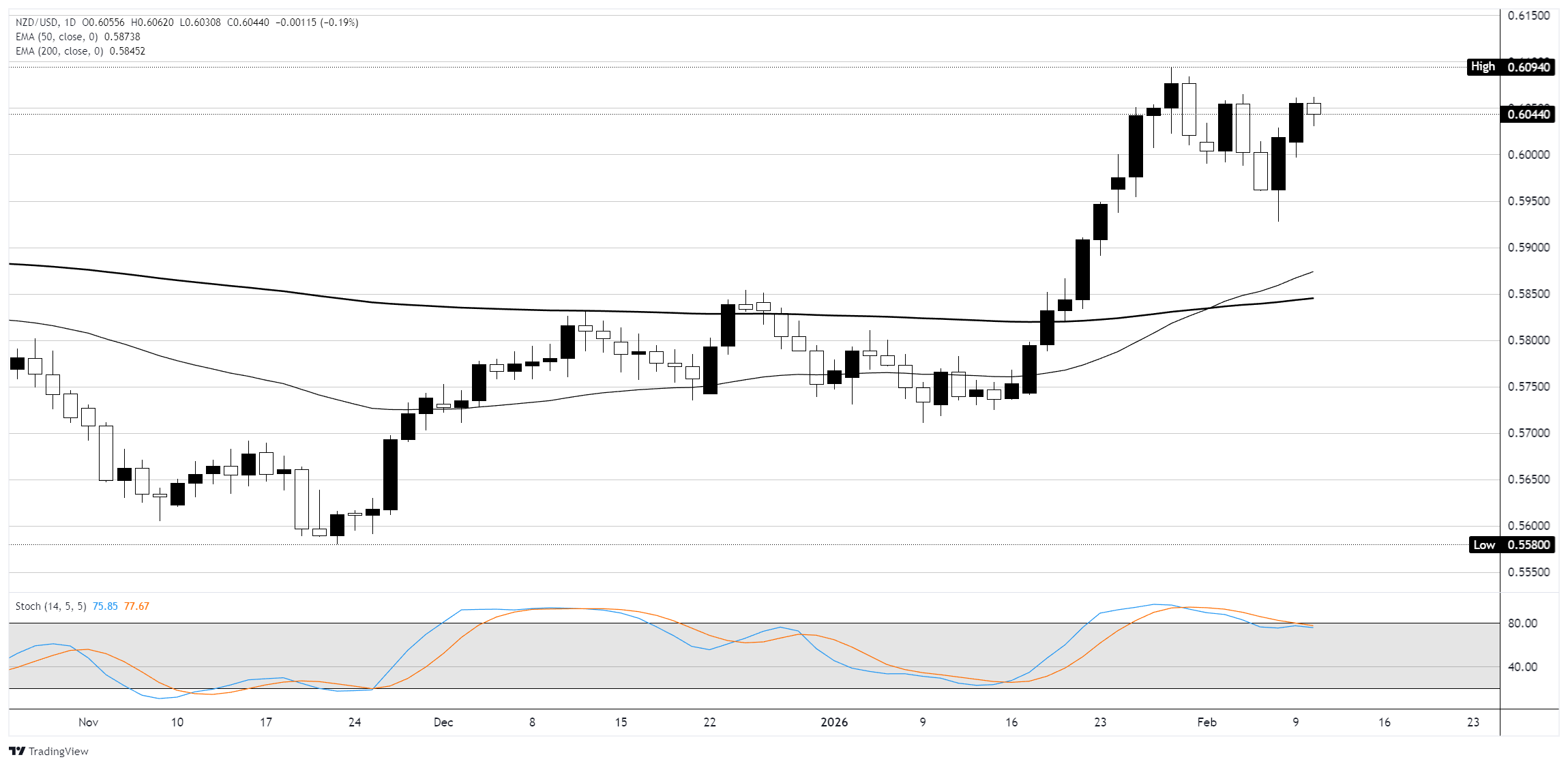 纽元/美元在日线图上呈现出明显的上升趋势,价格在经历了从11月底接近0.5580的强劲反弹后,稳稳保持在0.5874的50日指数移动平均线(EMA)和0.5845的200日EMA之上
