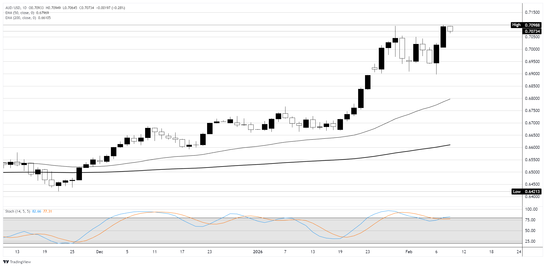澳大利亚元在日线图上保持强劲的上升趋势,价格远高于50日指数移动平均线(EMA)0.6797和200日EMA 0.6611,确认自11月底接近0.6421的低点以来,形成了明确的看涨结构,表现为更高的