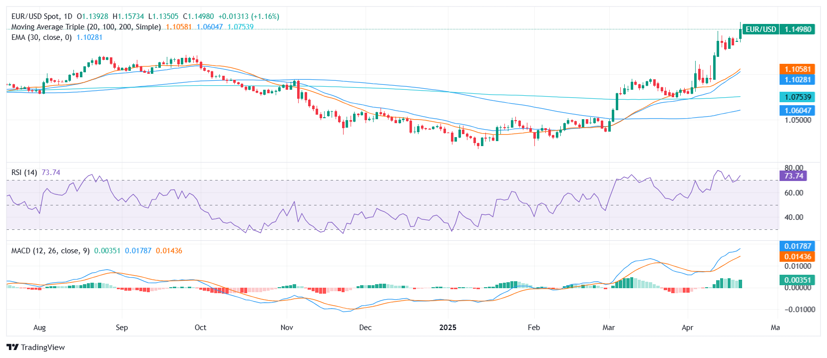 周一,欧元/美元在交易中获得牵引力,上涨至1.1500区域,日内涨幅为1%。该货币对在1.1391和1.1572之间处于中间区间,价格走势和技术指标支持看涨情绪