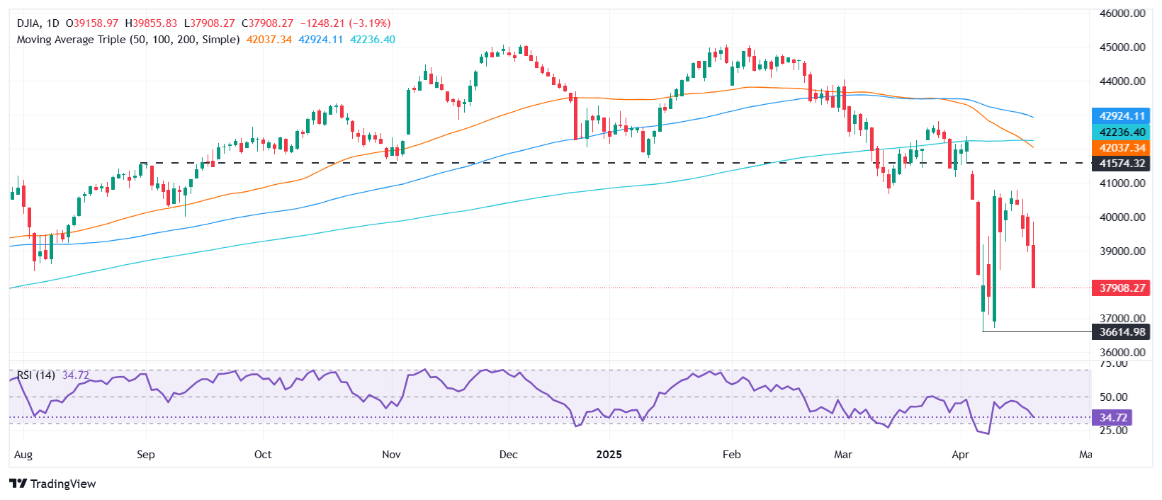 道琼斯工业平均指数(DJIA)在四月份第四次跌破38,000点,暴跌超过1,000点,或3%