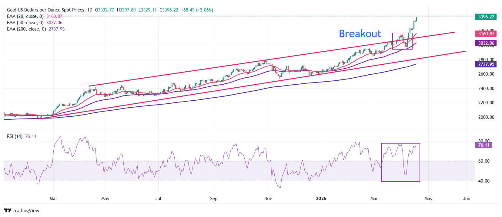黄金价格(黄金/美元)在周一北美交易时段接近3425美元,创下新历史高点。