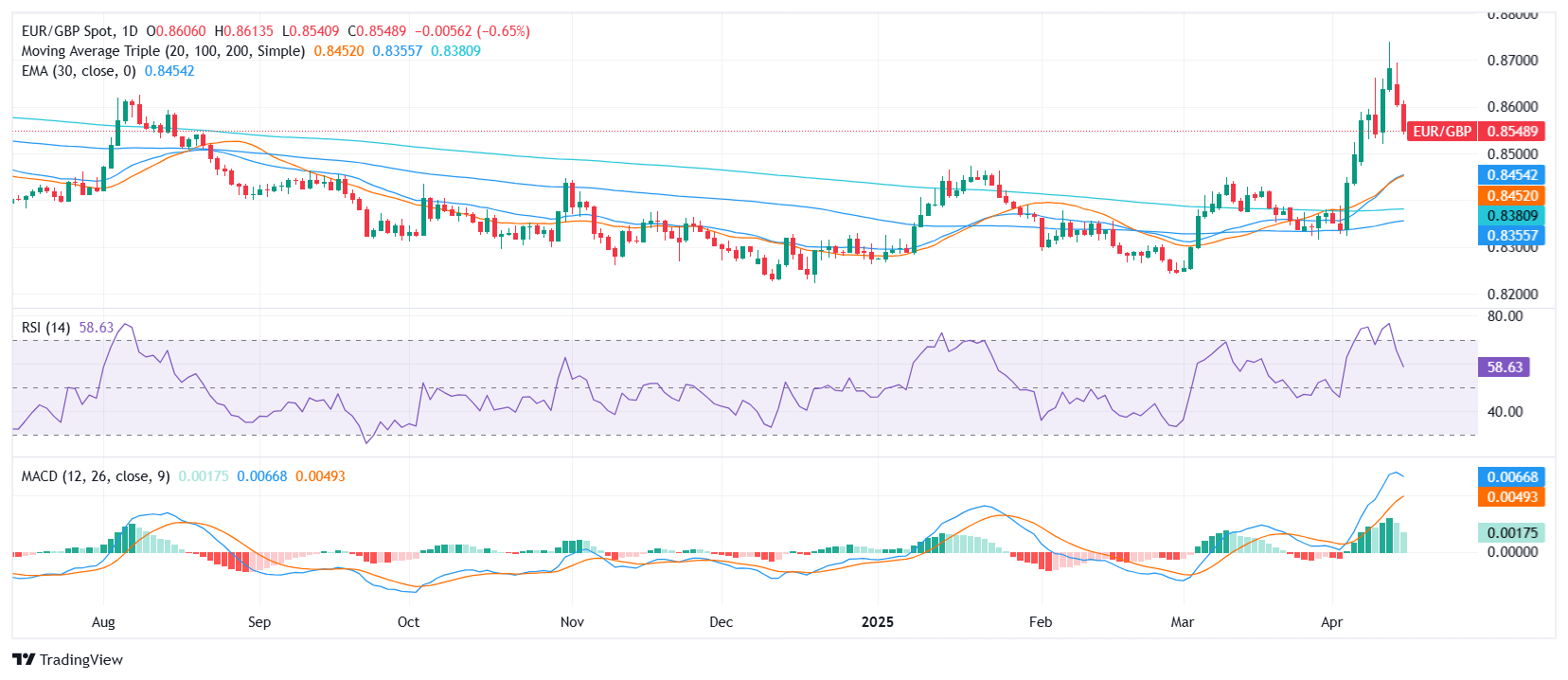 欧元/英镑在周二欧洲时段后小幅下跌,回落至日内区间底部,同时略高于关键技术水平。该货币对最后一次出现在 0.8500 附近,当日小幅下跌,但更广泛的信号仍指向潜在的看涨力量。