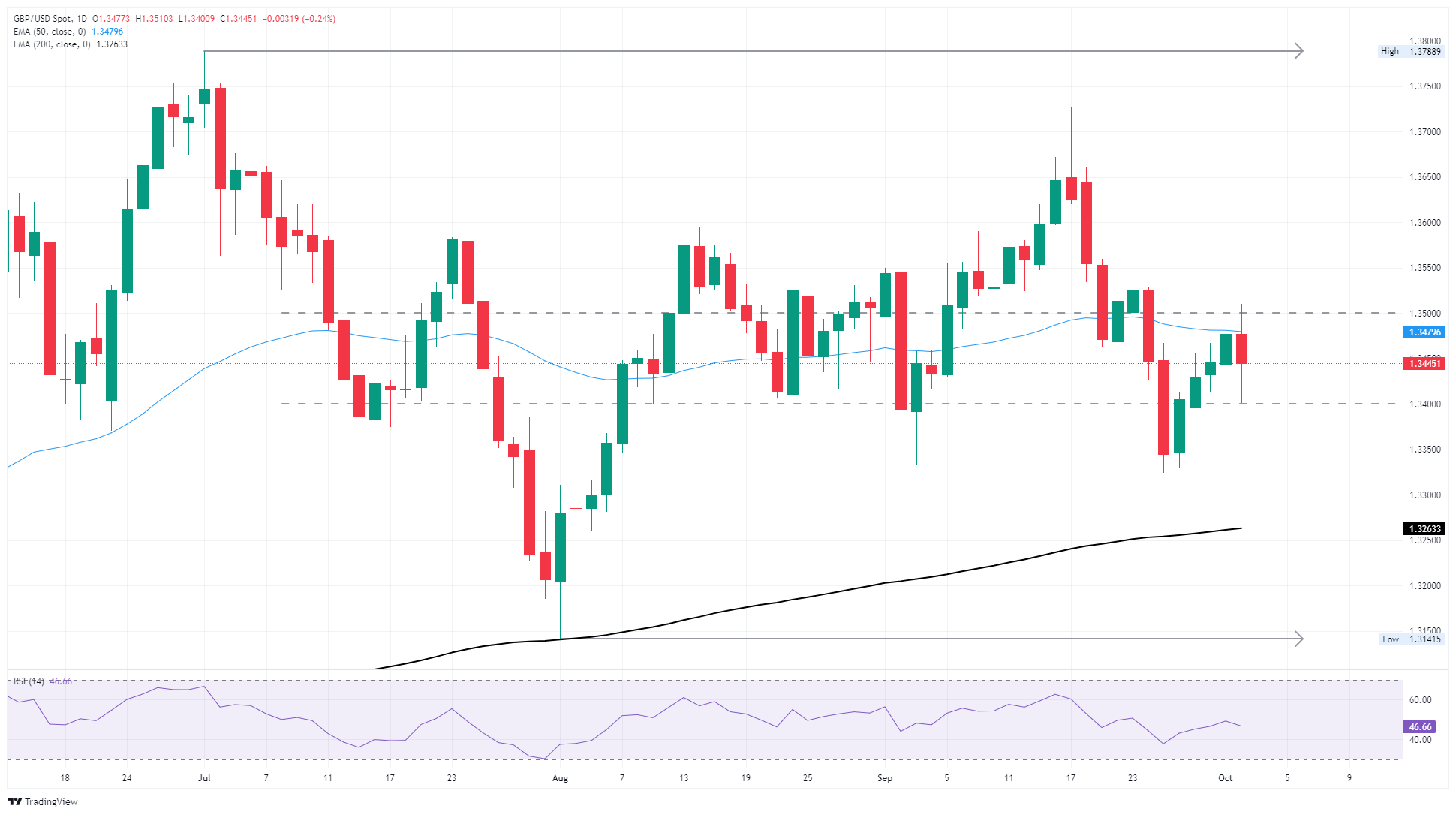 英镑/美元在周四回落,结束了四个交易日的上涨势头,并从1.3500关口的技术性拒绝中大幅下跌。英镑/美元正在从1.3400到1.3500的中期整合中回落,价格走势顽固地保持在50日指数移动均线下方。市场在动能上延长了暂停,投资者在权衡美国政府的联邦停摆将持续多久以及可能产生的经济影响。