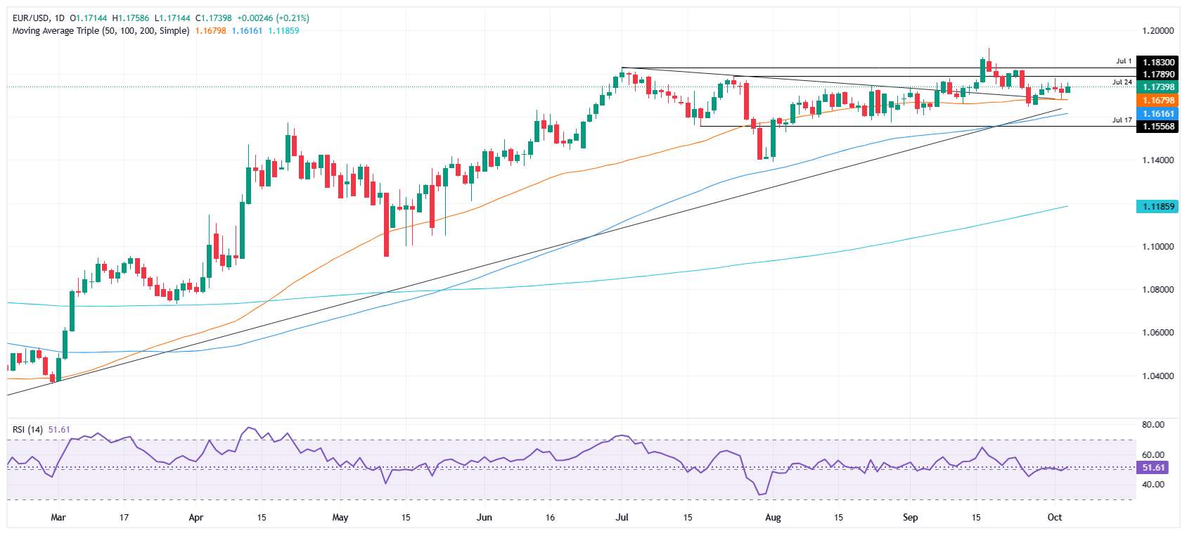 欧元/美元在周五因缺乏新的催化剂而盘整,交易时段较为平静,受到美国政府关门的影响,似乎将延续到本周以外。该货币对在撰写时交易于1.1738,上涨0.28%