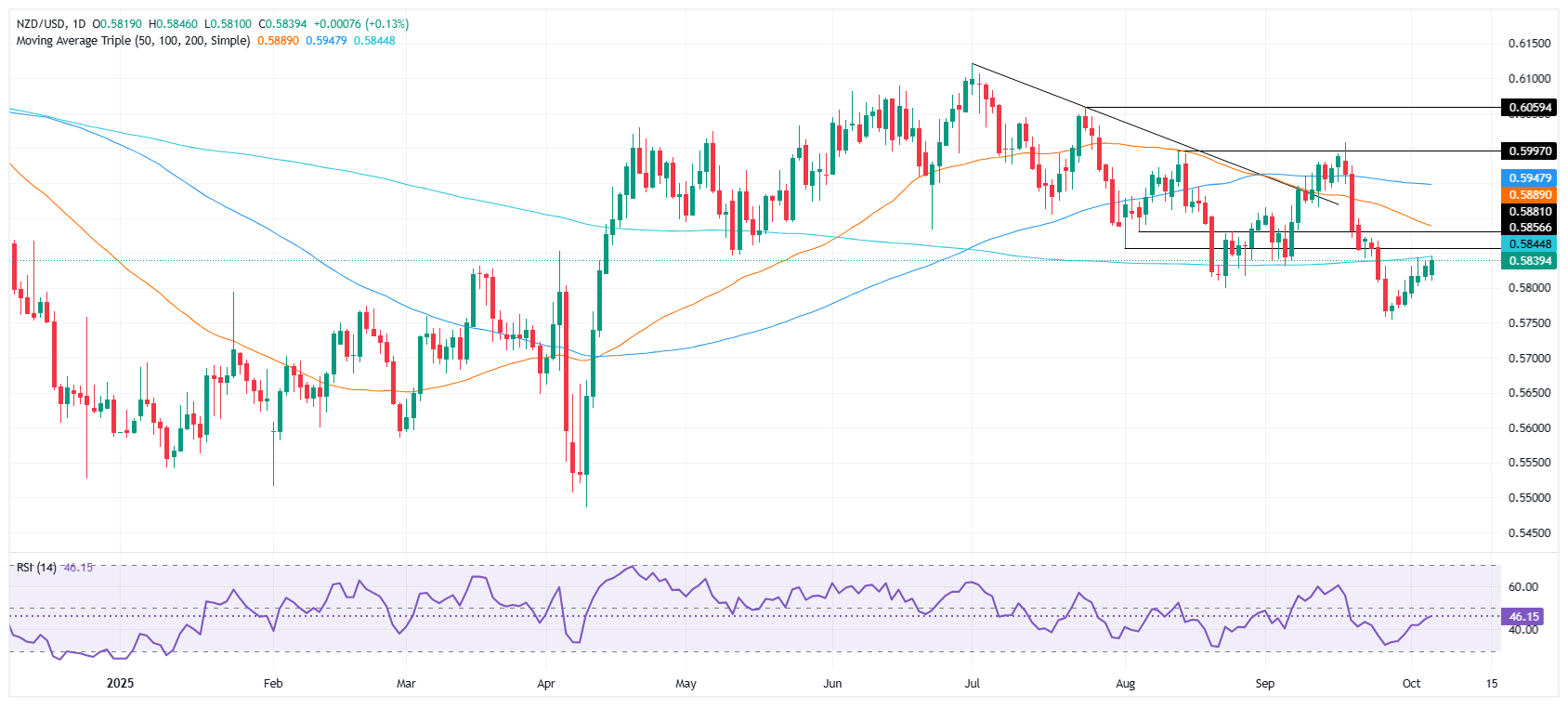 新西兰元在周一上涨,并在周二亚洲时段开始时交易于每日收盘价附近,约为0.5840。昨日,该货币对上涨了0.20%,但关键阻力位在上方,200日简单移动平均线(SMA)位于0.5848。