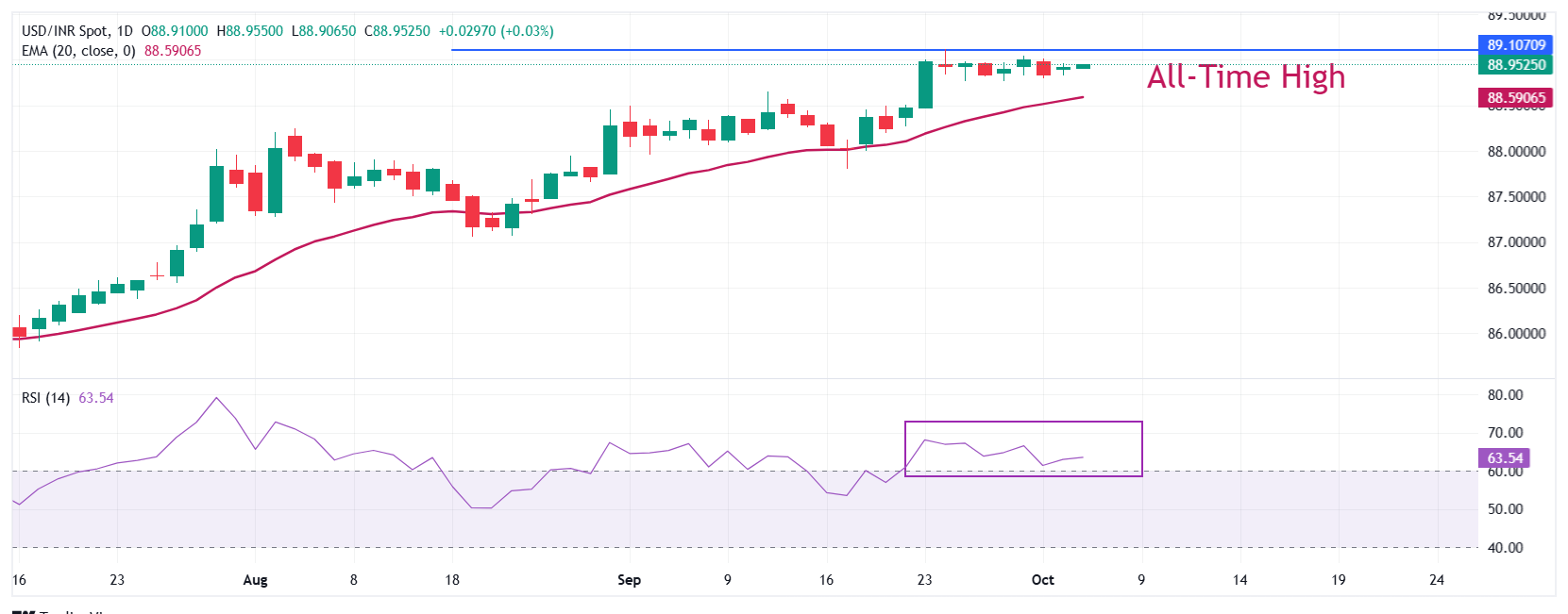 印度卢比(INR)在周一以88.90的平稳水平开盘,兑美元(USD)。美元/印度卢比(USD/INR)货币对整体坚挺,仍接近9月24日创下的89.12的历史高点。