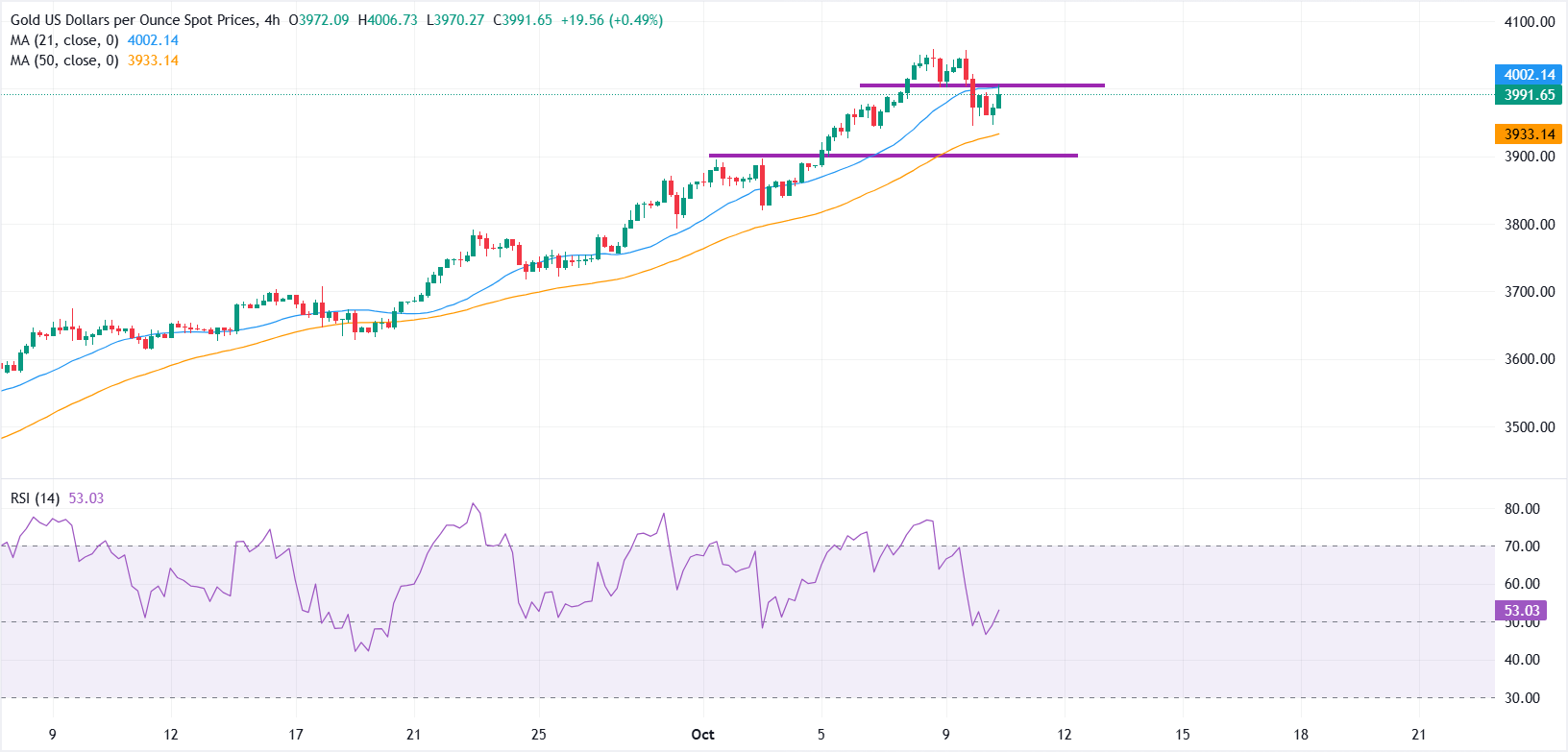 黄金在4000美元下方盘整,因过度上涨后的看涨动能降温