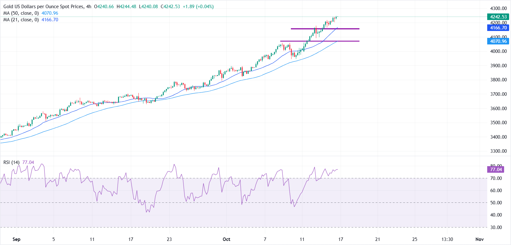 黄金(XAU/USD)在周四延续其不懈的上涨势头,创下新的历史高点,因为在日益加剧的地缘政治和经济不确定性中,避险需求依然强劲。截至发稿时,黄金/美元交投于 4290 美元附近,本月迄今上涨近 11%,年初至今上涨超过 60%