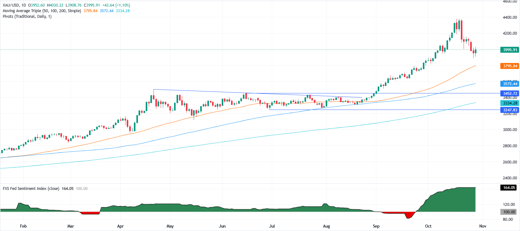 周三,金价在前一天触及三周低点3,886美元后恢复了一些涨幅,交易商在等待当天稍晚的美联储(美联储)决策。黄金/美元交易于3,998美元,结束了连续三天的跌势。