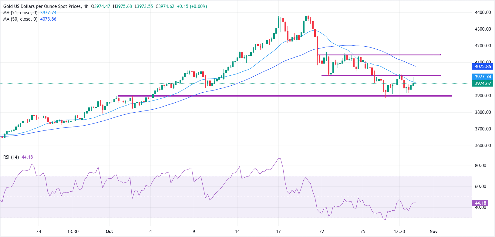 黄金(黄金/美元)在经历了一次波动的交易后,于周四企稳,交易员消化美联储(Fed)的降息和谨慎的货币政策前景。在撰写本文时,黄金/美元交易在3980美元左右,短暂回到4000美元的心理关口,日内上涨约1.20%。