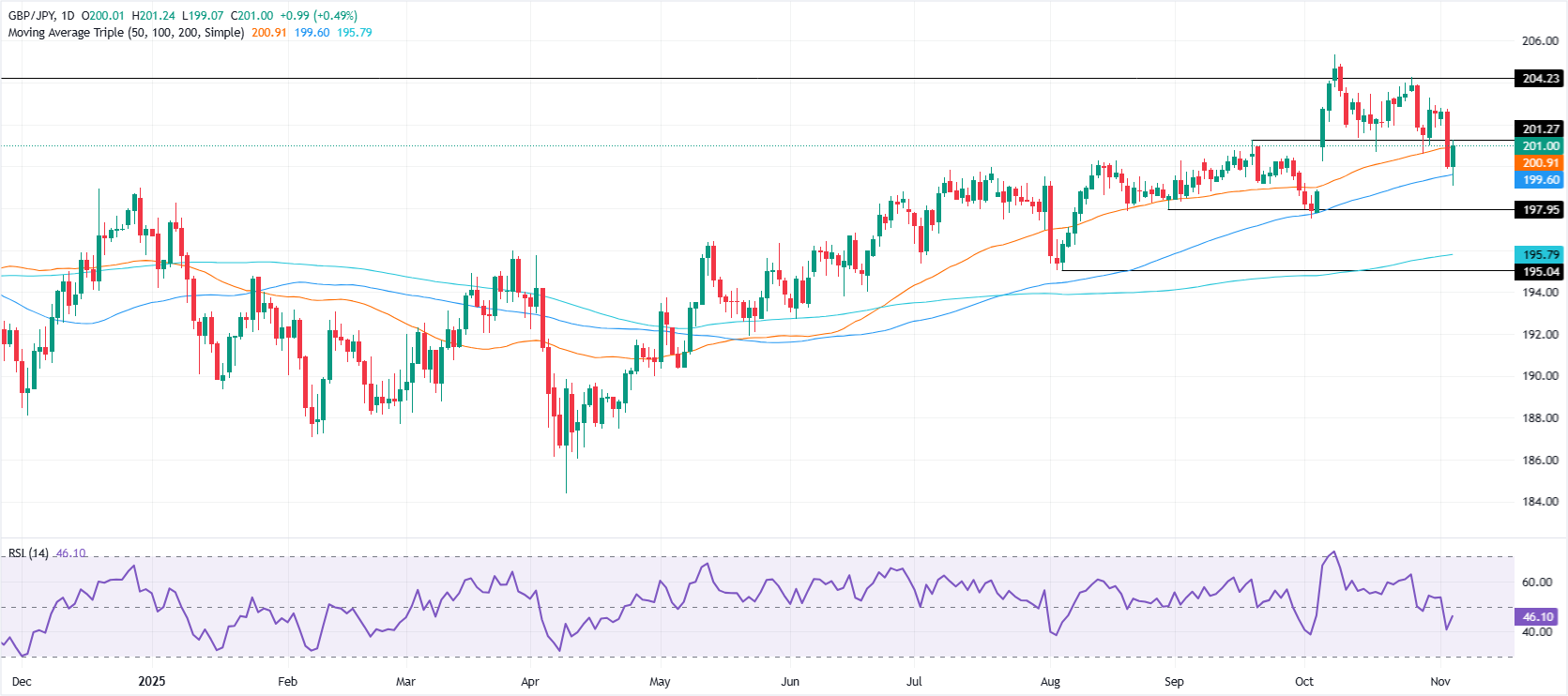 周三,英镑/日元出现复苏迹象,交易价格高于 200.97 的 50 日简单移动均线 (SMA),此前在交易时段早些时候触及日低 199.61。截止发稿时,该货币对交易于 201.10,上涨 0.53%