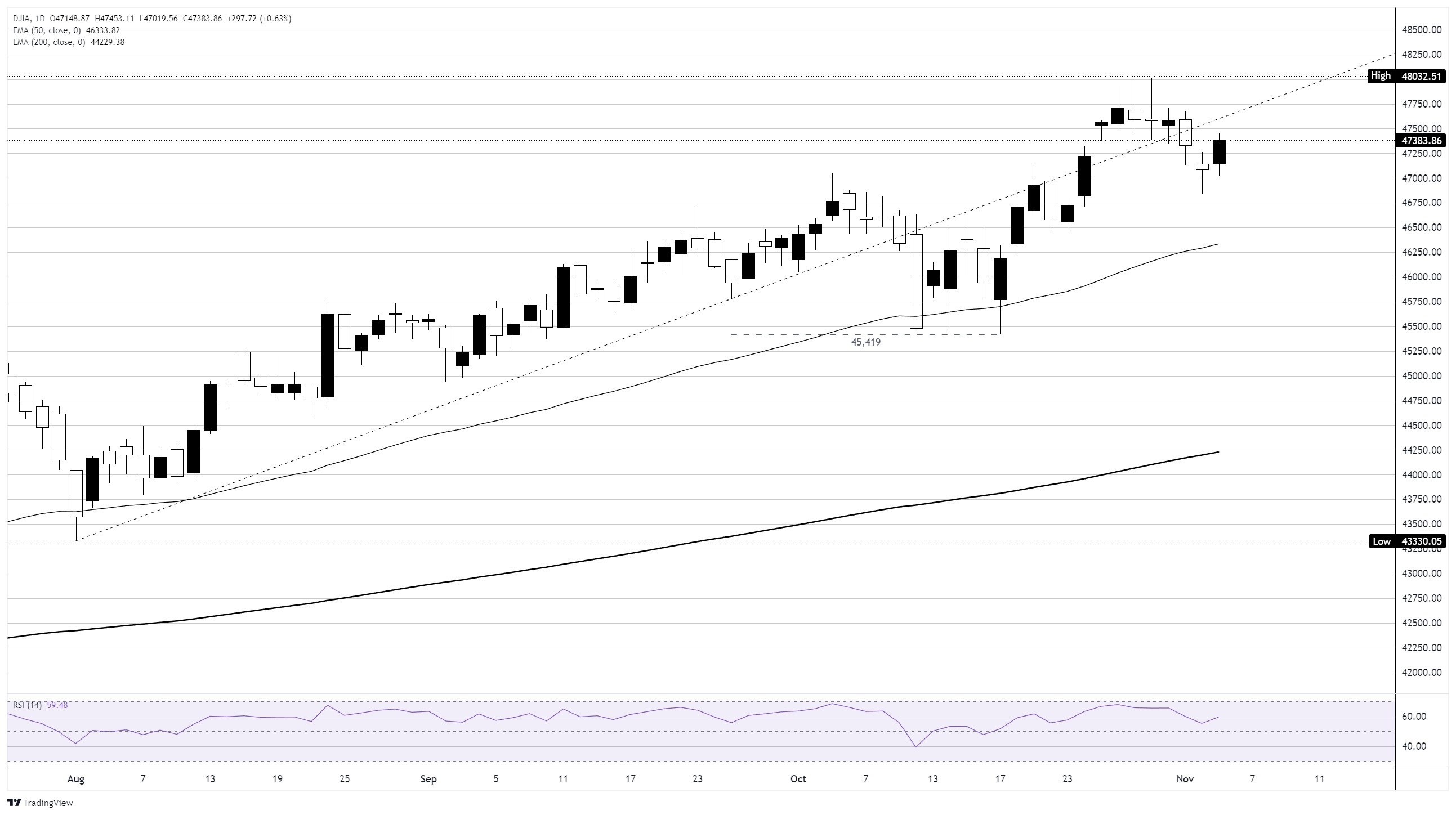 道琼斯工业平均指数(DJIA)在周三抑制了看跌走势,在接近47,200水平附近找到短期支撑,并上涨300点,因为股市在本周初在高度集中于人工智能和科技基础设施板块的暴跌后恢复。