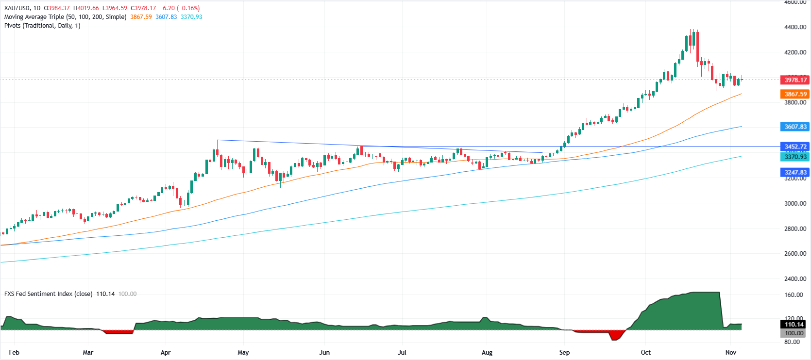 黄金价格在周四上涨,触及日高4,019美元,但在美元和美债收益率下跌的情况下回落至4,000美元以下。截至发稿时,黄金/美元在3,985美元附近上涨超过0.10%