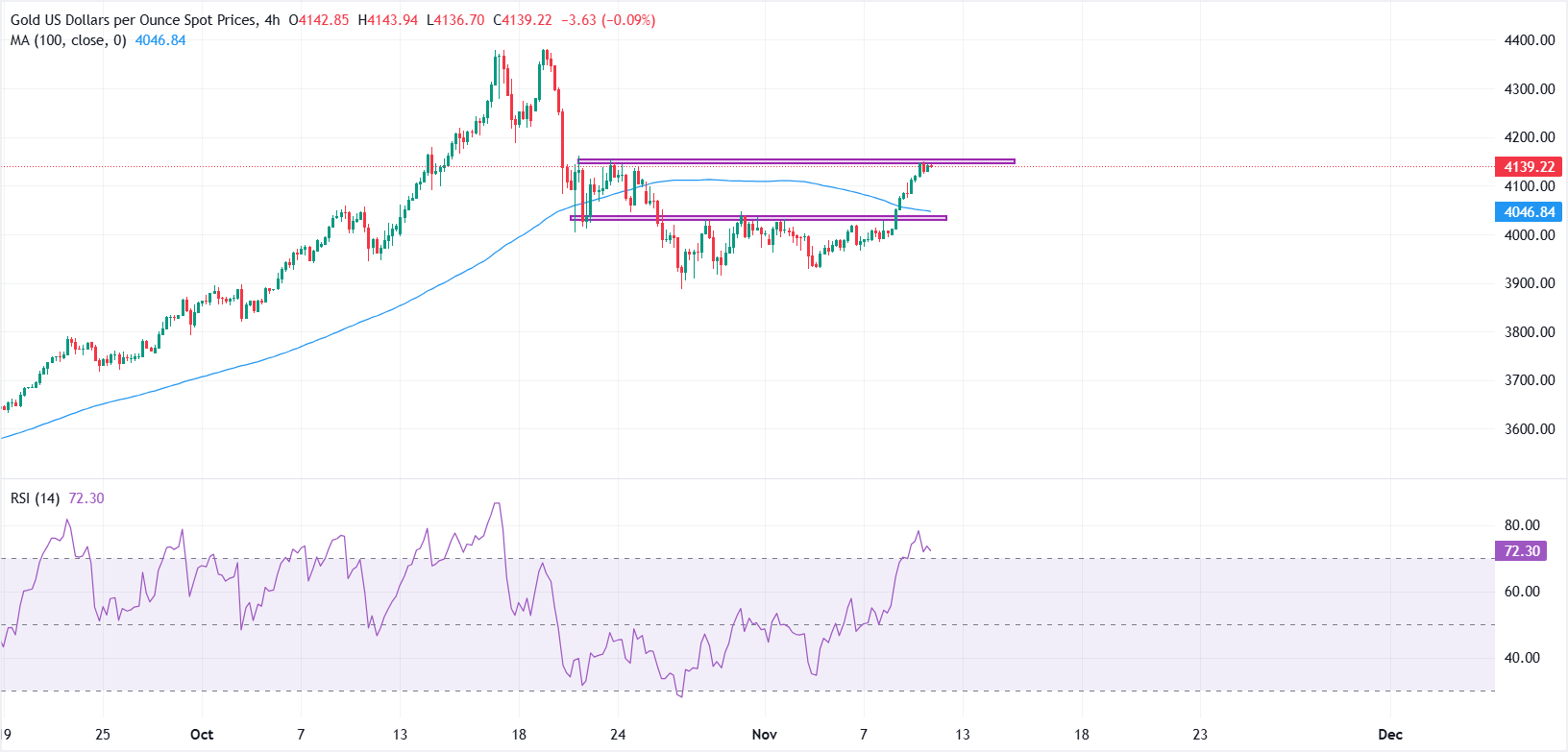 黄金(黄金/美元)在周二削减了早前的涨幅,卖盘在4150美元附近出现,金属难以延续周一的急剧上涨。撰写时,黄金/美元交易在4107美元附近,继在欧洲时段早些时候触及三周高点后回落。