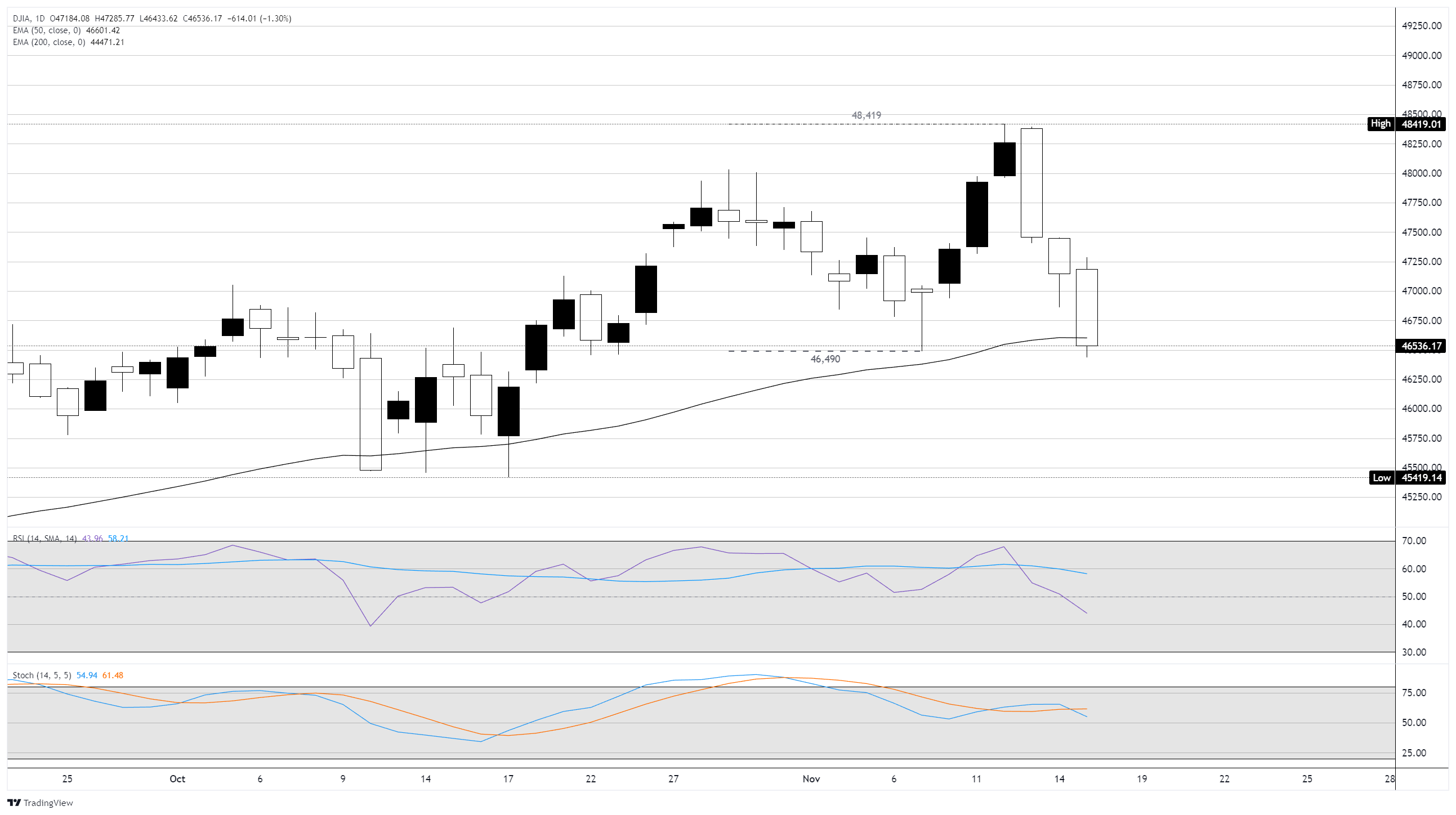 道琼斯工业平均指数因对人工智能的担忧和美联储的不确定性跌破47,000点