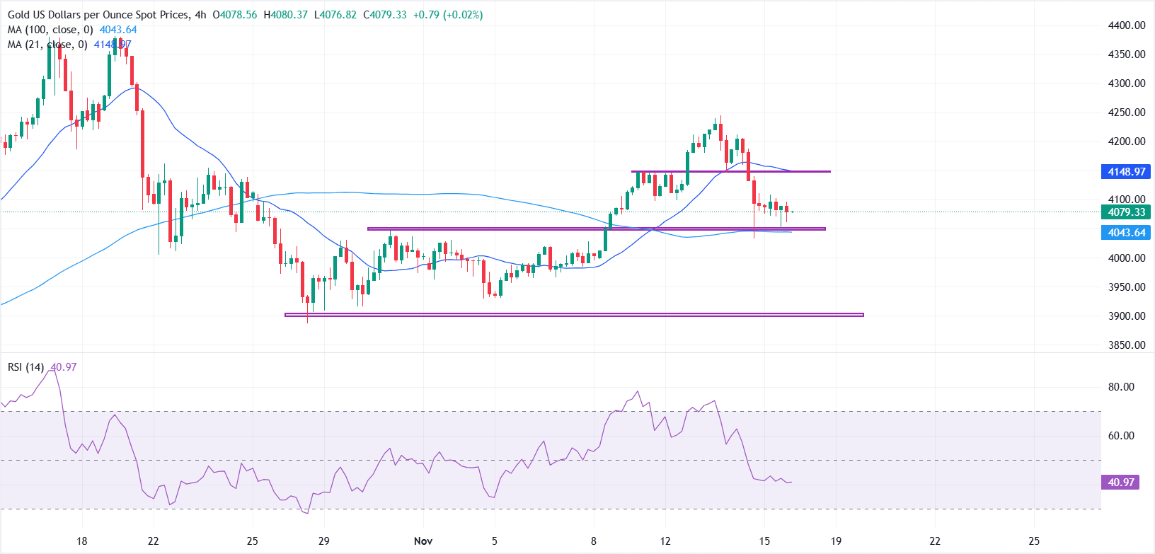 黄金(XAU/USD)在本周以低迷的姿态开局,在经历了上周突破三周高点后的两天下滑后,正在整固损失。截至发稿时,XAU/USD交易在约4075美元,涨幅受到更强美元(USD)和对美联储(Fed)12月降息预期减弱的限制。