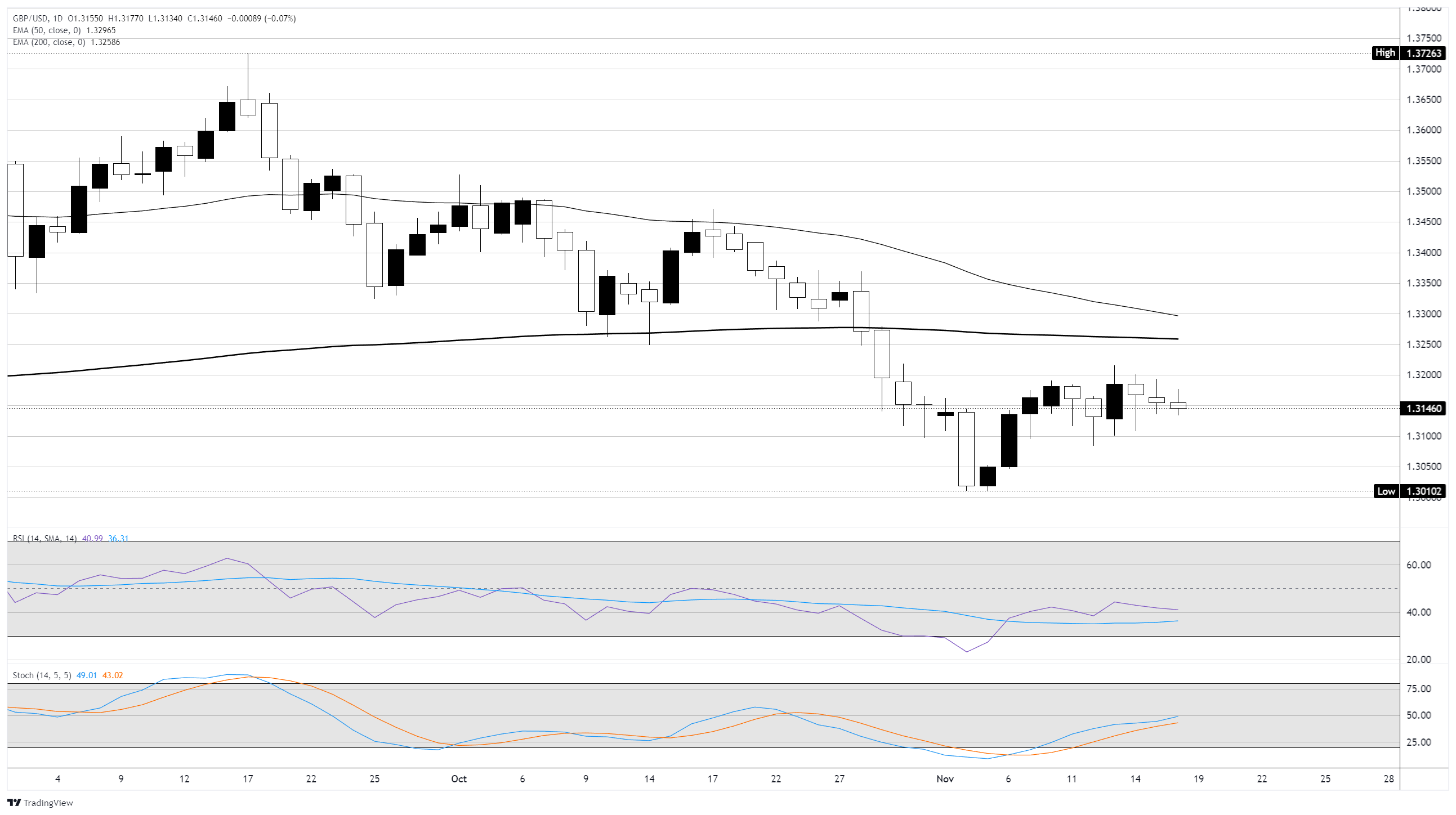 英镑/美元仍然被困在一个粗略的短期盘整区间,英镑在1.3150区域附近寻找买盘。该货币对在从七个月低点反弹后已失去动力,英镑(GBP)在11月份基本保持不变
