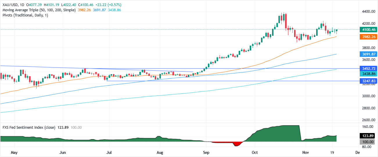 周五北美时段,黄金(黄金/美元)保持稳定,美联储(Fed)官员在12月会议上为降息敞开了大门。截至撰写本文时,黄金/美元交投于4096美元,上涨0.53%,此前触及日高4101美元。