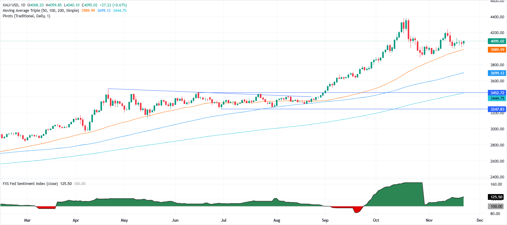 周一,黄金(黄金/美元)大幅上涨,涨幅为0.80%,投资者似乎对美联储(Fed)将在12月会议上降息充满信心,因为美国经济数据持续发布。截至发稿时,黄金/美元在4100美元附近交易,此前曾触及日低4040美元。
