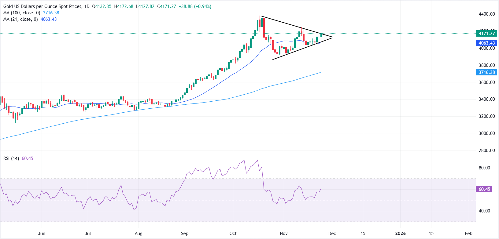 黄金(XAU/USD)在周三保持坚挺,交易者对美联储(Fed)更加鸽派的前景表示乐观,黄金/美元在约4150美元附近交易,稍微回落,此前在当天早些时候攀升至约4173美元的两周高点。