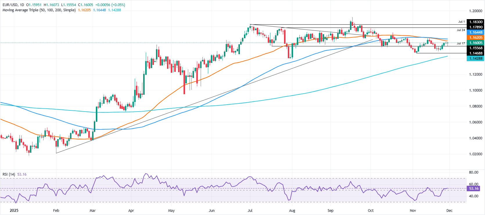 欧元在1.1600上方保持坚挺,12月鸽派押注上升至87%