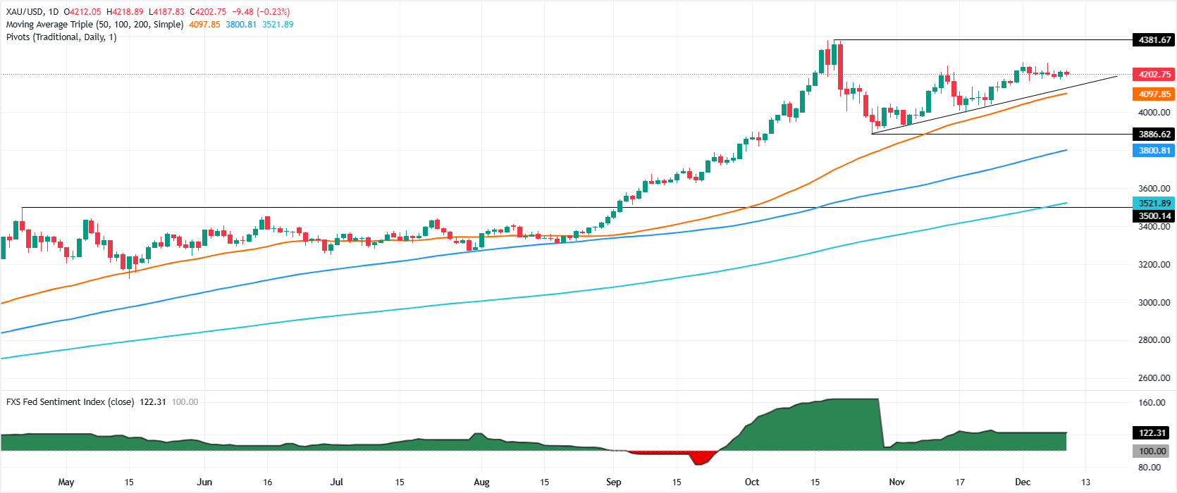 黄金(黄金/美元)周三上涨近0.50%,美联储如预期降息25个基点,投票结果为9比3,随后美联储主席杰罗姆·鲍威尔召开新闻发布会,表态中立。