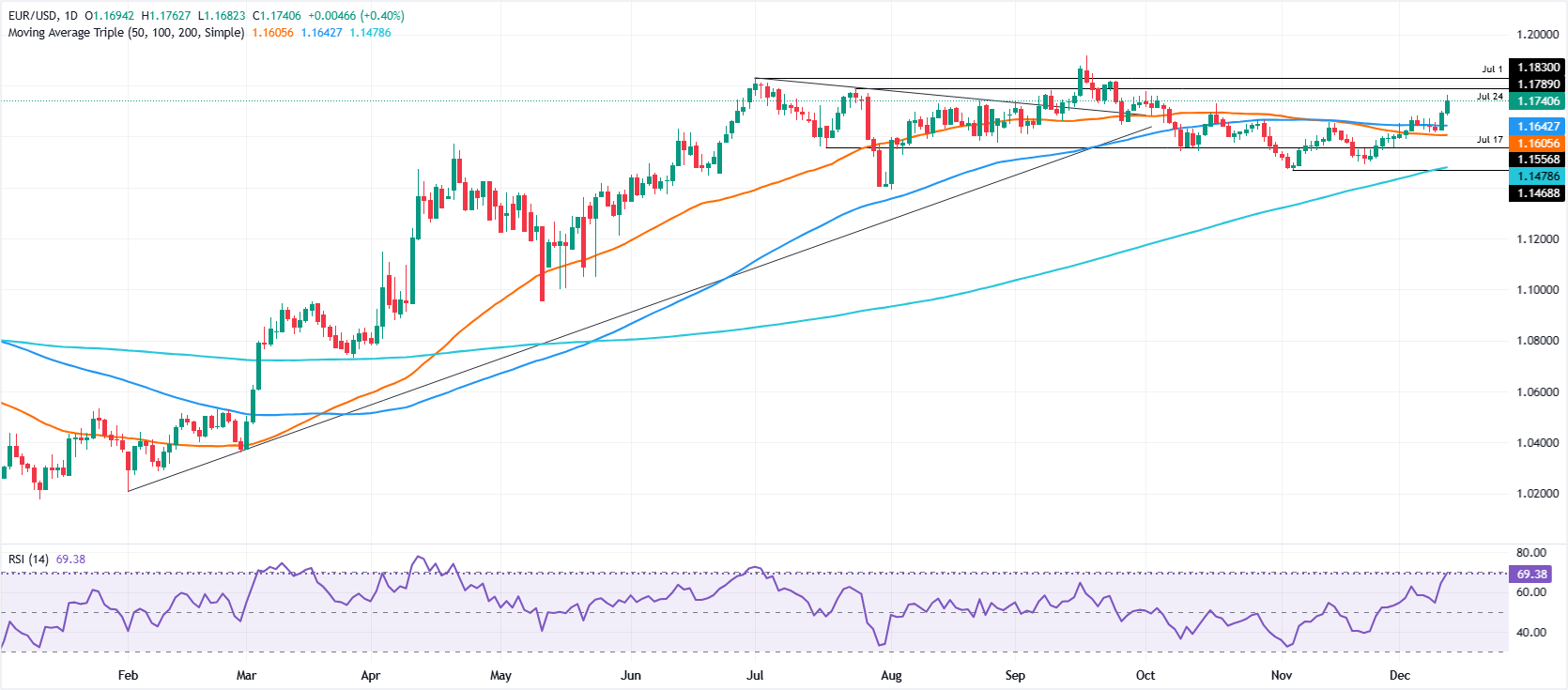 欧元/美元在周四北美时段上涨0.41%,因美联储决定降息,同时美国(US)发布的就业数据低于预期。撰写时,该货币对交易于1.1742,从日内低点1.1682反弹。