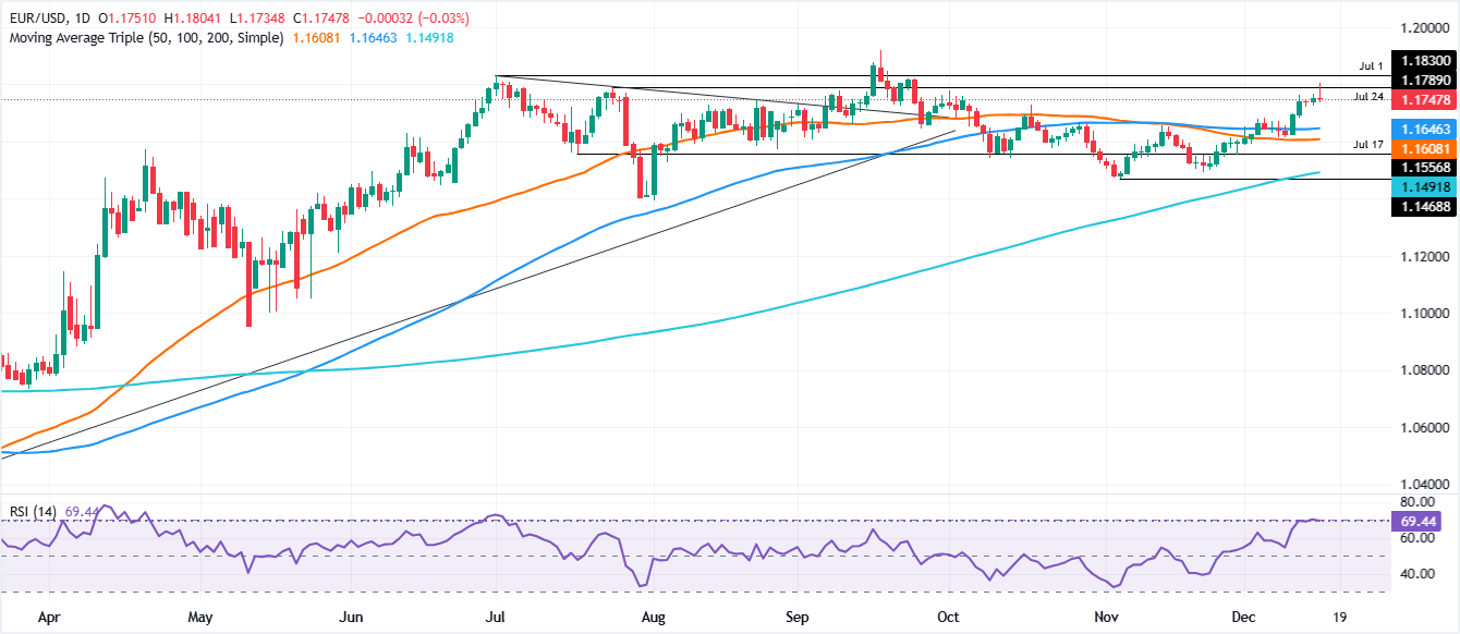 欧元/美元在1.1750附近保持坚挺,在最新的美国就业报告强化了美联储(Fed)可能将继续宽松周期至明年的情况下,几乎持平。撰写时,该货币对录得微小跌幅0.04%