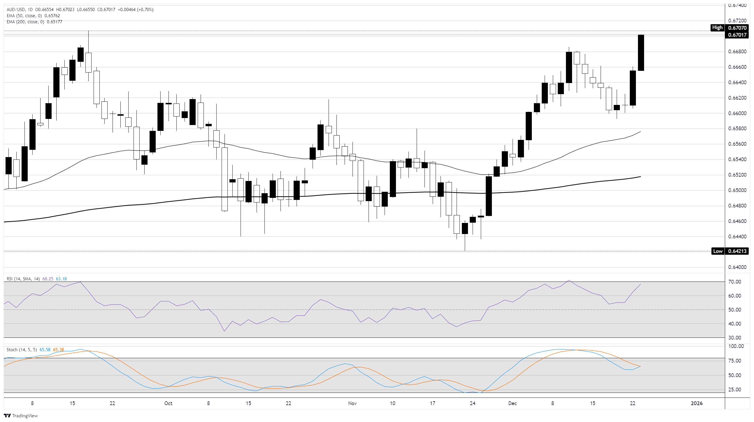 周二,澳元/美元连续第二天大幅上涨,涨幅达0.67%,并在美元(USD)普遍下跌的情况下,进一步增加了前一天0.68%的涨幅。