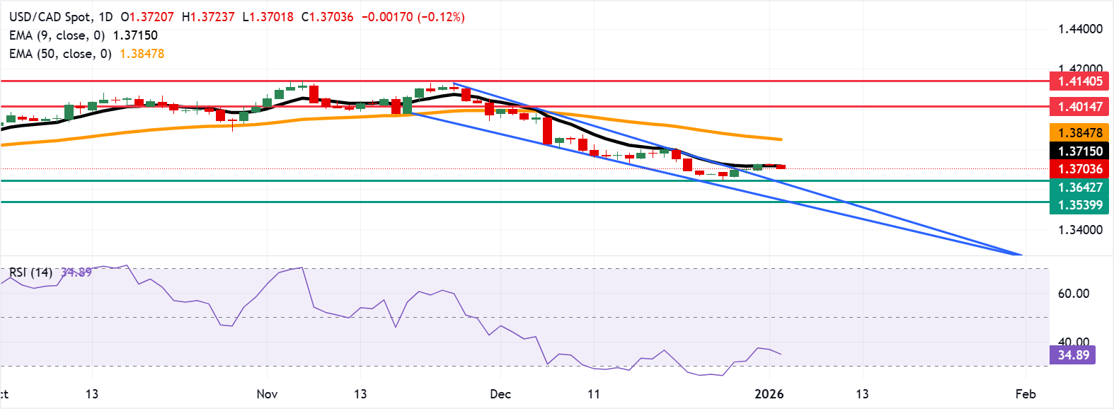 美元/加元价格预测:徘徊在1.3700附近,低于九日指数移动平均线