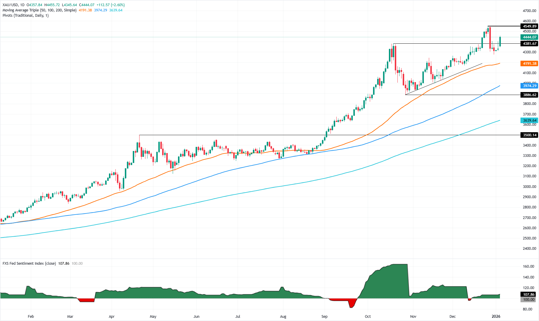 黄金(XAU/USD)在周一大幅上涨,涨幅超过2.60%,投资者评估上周美国对委内瑞拉的打击及其全球地缘政治影响。截至发稿时,XAU/USD交易于$4,442,反弹自日低$4,345。