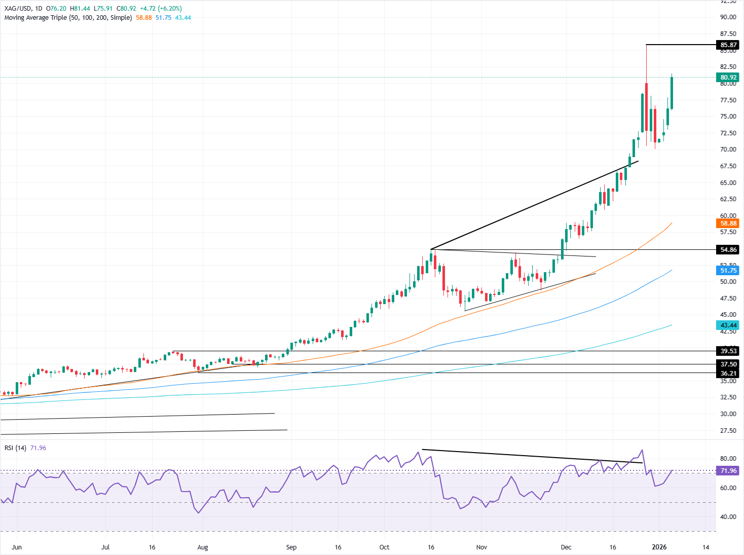 银价(XAG/USD)继续呈抛物线式上涨,周二上涨超过5%,每盎司交易价格超过80.00美元,尽管美国国债收益率上升和美元走强。