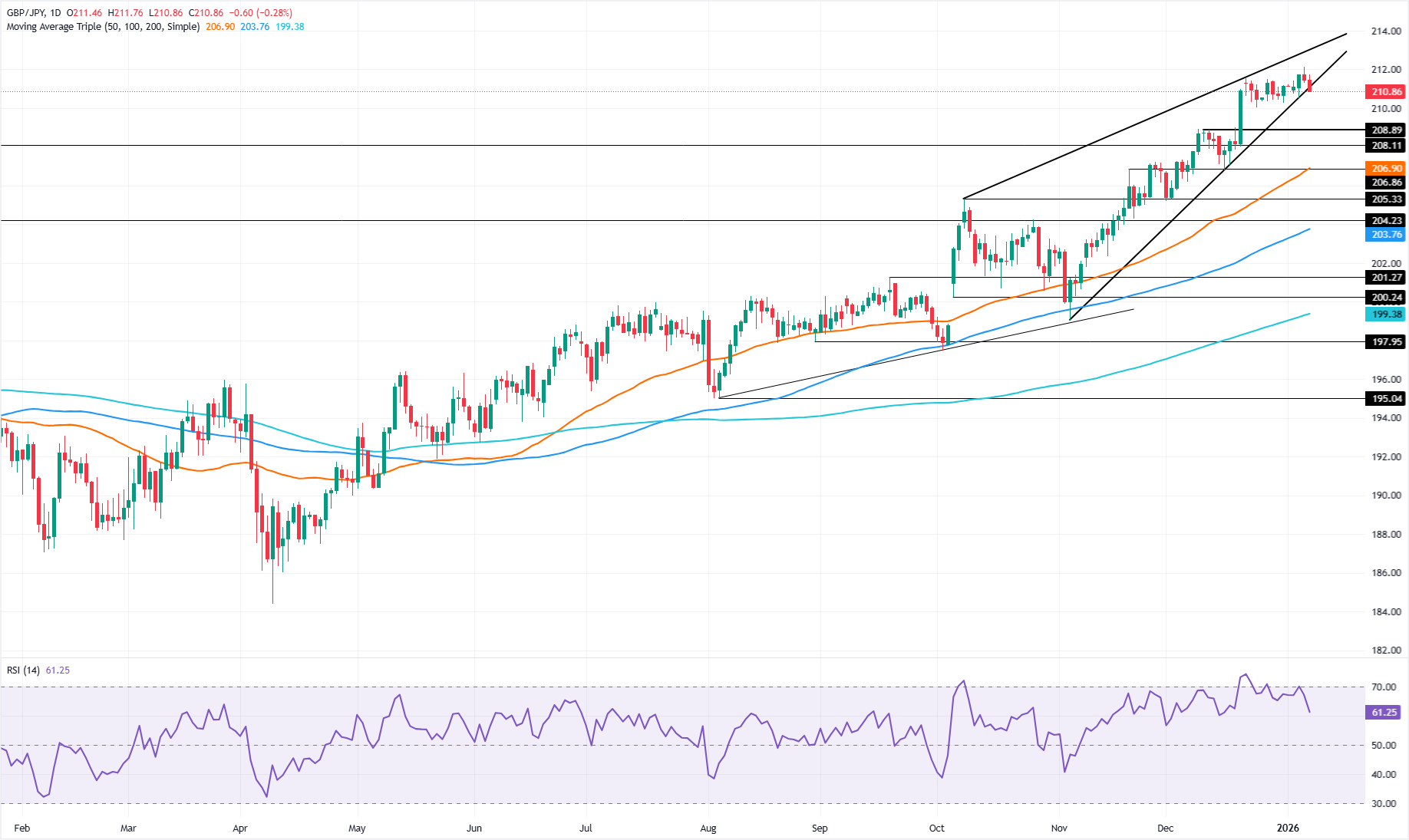 英镑/日元周三连续第二天下跌,在周二触及年内高位 212.16 后,跌破 211.00,录得 0.27% 的跌幅。随着周四亚洲时段的开始,该货币对交投于 210.85,持平。
