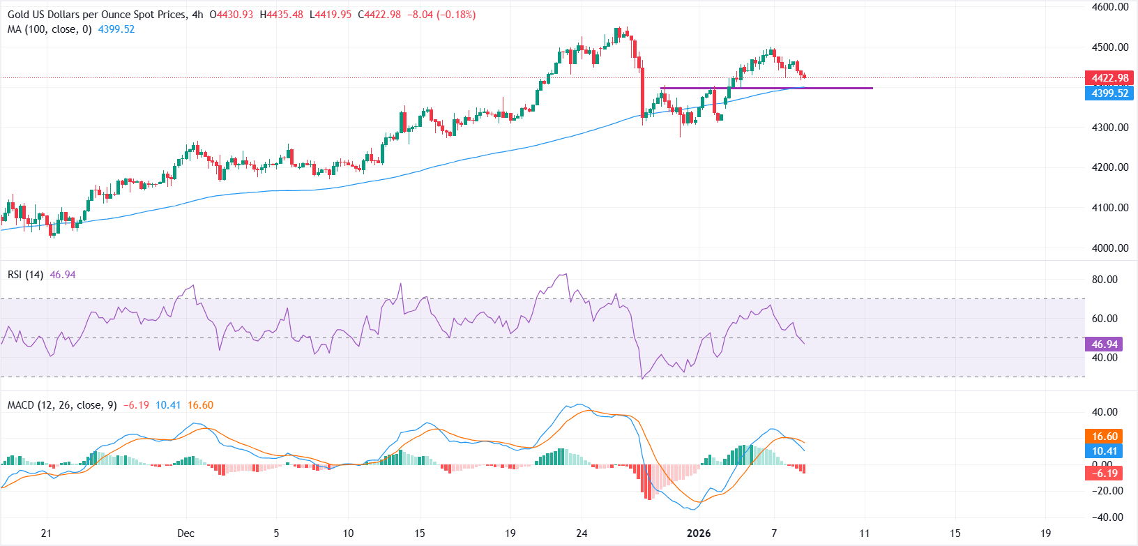黄金(XAU/USD)在周四继续承压,价格连续第二天回调,因看涨动能在接近4500美元心理关口时遭到拒绝。截至发稿时,XAU/USD交易在4425美元附近,下跌近0.60%。