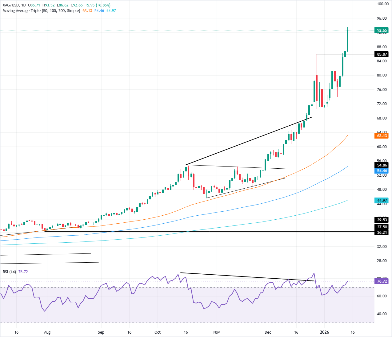 周三,白银价格在从日内低点 86.91 美元反弹后飙升至新纪录高点 93.52 美元,似乎有望在短期内突破 100.00 美元关口。截至发稿时,白银(XAG/USD)交易价格为 93.05 美元,飙升超过 7%。
