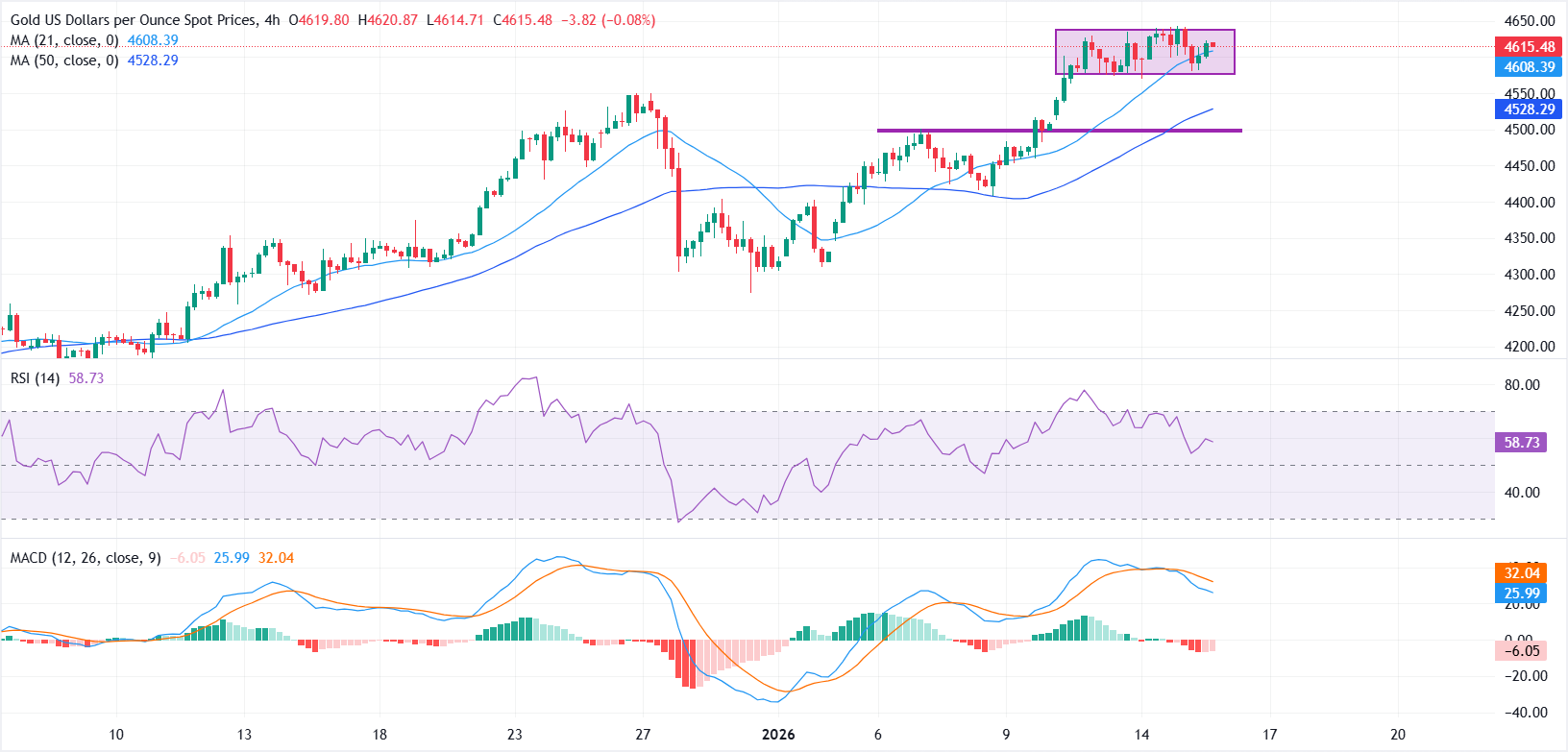 黄金(黄金/美元)周四走势略显负面,因交易者在周三飙升至接近 4,643 美元的历史新高后获利了结。截至撰写时,黄金/美元在 4,586 美元附近交易,日内下跌近 1%