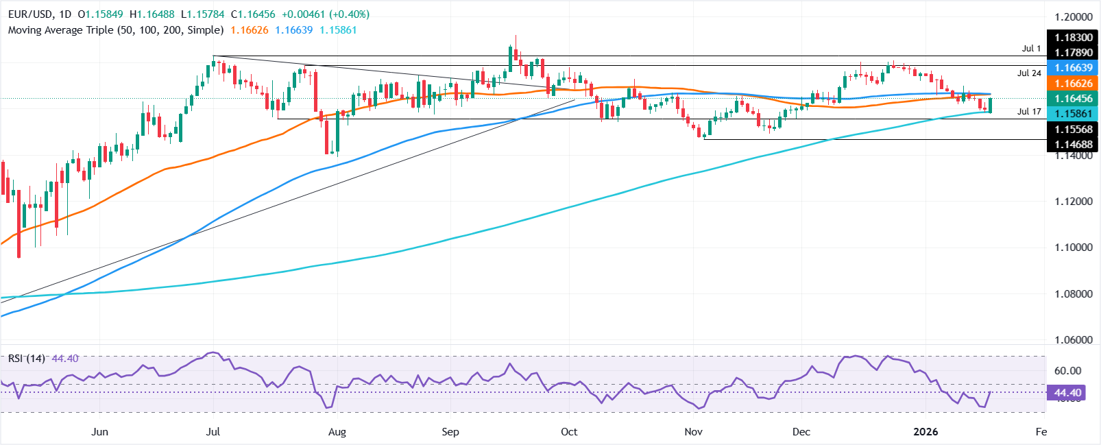 欧元/美元周一上涨超过0.40%,因交易者抛售美元,风险偏好因特朗普决定升级美欧贸易战而恶化,白宫对格林兰的利益也在其中。该货币对在触及日内低点1.1576后,现交易于1.1642。