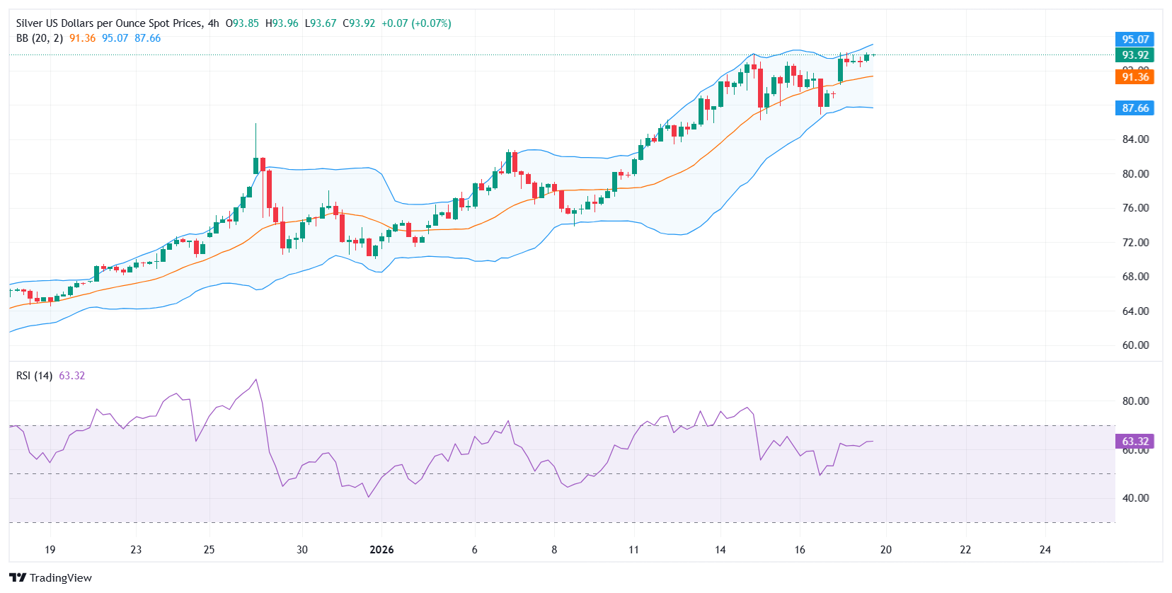 白银(XAG/USD)在周一延续历史性反弹,飙升至接近 94.15 美元的历史新高,因在贸易和地缘政治紧张局势升级的背景下,强劲的避险资金流推动了对贵金属的需求