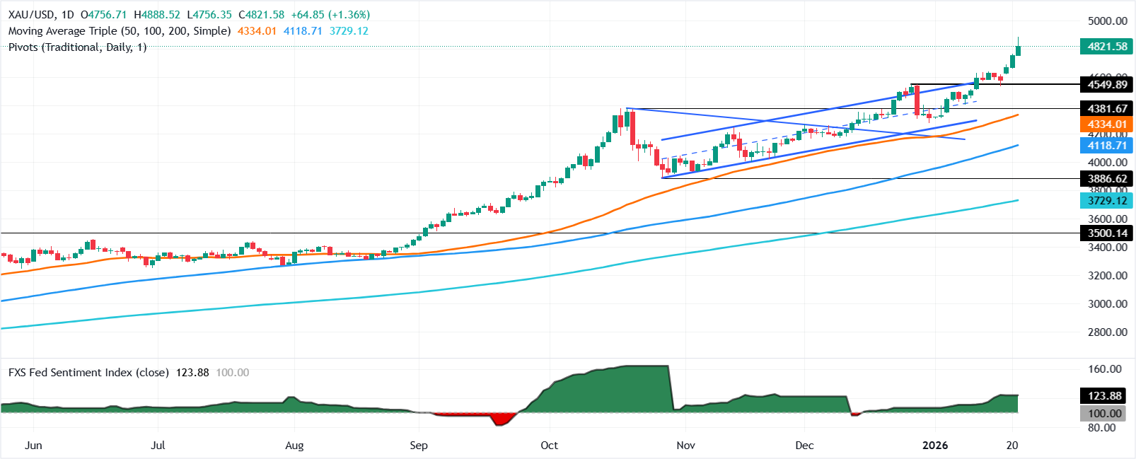黄金(黄金/美元)在周三北美时段上涨,较早前从4888美元的历史新高回落后上涨0.25%,此时美国总统唐纳德·特朗普对格林兰的言辞有所缓和。