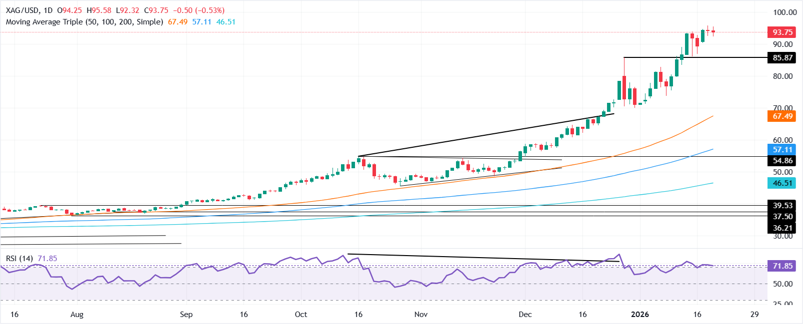 白银价格(XAG/USD)在周三回撤,此前在美国总统唐纳德·特朗普在达沃斯演讲中语气缓和,表示他准备与丹麦谈判格林兰后,触及日高95.56美元